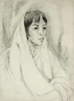 After the honeymoon trip, the young couple returned to California, but visited Taos regularly over the next two decades. A critic in California, writing about one of her exhibits, referred to Gene as "the artist who commutes to Taos." (right Of Taos/Apache Lineage #503)