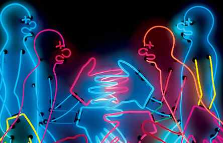 Nauman's word game neons evoke poetry that cuts to the essence of the human condition. The confrontational potential of neon offers harsh and socio-political commentary in such pieces as Raw War (1970), Violins Violence Silence (1981-82) and Run From Fear, Fun from Rear (1972). The monumental One Hundred Live and Die (1984), his largest and most complex neon piece, overwhelms the viewer with strong directives.