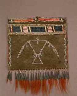 "The exhibition focuses on two themes: Sacred Imagery & Ritual Objects and Secular Objects & Enduring Traditions," says Tarver. A journey through the exhibition reveals how Native American spirituality and mythology are reflected in the arts. Objects include beautifully carved wood sculpture and stone pipes, and elaborately beaded and quilled objects such as bandoleer bags, moccasins and pipe bags. An extraordinary example of an ordinary object endowed with spirituality is an Eastern Chippewa buckskin and porcupine quill pouch (18th century). The front of the pouch depicts a quilled image of a thunderbird, a mythical spirit being. The pouch is functional, but the thunderbird symbol is sacred. The design of the pouch may have come from European soldiers who used a similarly styled pouch to carry gunpowder. However, the design and decoration for the Chippewa pouch suggests its purpose served more of a ritual function.