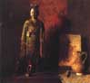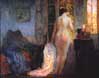 In his oriental still life painting, Pushman managed to create an atmosphere of nocturnal and contemplative intimacy through his meticulously arranged objects and their backgrounds. Pushman's concern for the objects in his paintings was of symbolic and religious importance. His oriental male and female figures represent the legends of the ancient East and Far East. They epitomize the experience of life, which implies a longing for the eternal. These small figures included the Sacred horse, the long robed statuette of a woman, a six armed Deity, the Buddha god of peace, the warrior, and the nude female figure which is emerging from her veils that are the Mystery of Life. Other special objects in Pushman's compositions were a 2000 year old iridescent glass pitcher, a lacquered chest, a teakwood box, small carved figures of saints from 13th and 14th century France and ancient Persian plates. The backgrounds usually consisted of rare centuries-old tapestries and textiles.