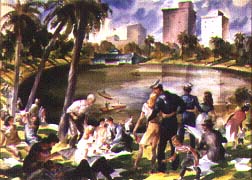In reaction to the demand for this new American perspective, the California School painters began to record the local character, people, and atmosphere familiar to them. They worked to depict the regional landscape, ranging from farms to beaches, and the activities of California towns and cities in a lively narrative form. Their search for an authentic indigenous style to capture the character of this area resulted in bold and powerful images, as well as a special way of painting light and form.