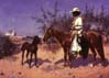 While raiding parties tended to be small and stealthy, these advance scouts carry weapons that suggest they are out for blood and would welcome a fight. Apparently they have spotted something and are waiting for the others to catch up. Russell often set scenes like this at day's end and in later works the Indians became almost unthreatening as they basked in the sun's fading warmth, perfect symbols of Russell's own nostalgia for the vanished West. Here, although the sky is roseate and the setting sun washes the men in pinks and reds, they exude menace and appear lean, tough and full of fight.